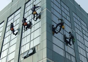 高層外墻清潔、高層玻璃幕清潔、高層外墻粉刷,高空外墻廣告安裝,因為高層外墻工程存在著危險性和復雜性,所以這項工作以是有著相當程度的科學性和專業(yè)性。 特此我們的施工人員是經(jīng)過專業(yè)培訓后及有多次高空作業(yè)經(jīng)驗。我們一直采用坐式吊繩清潔方法: